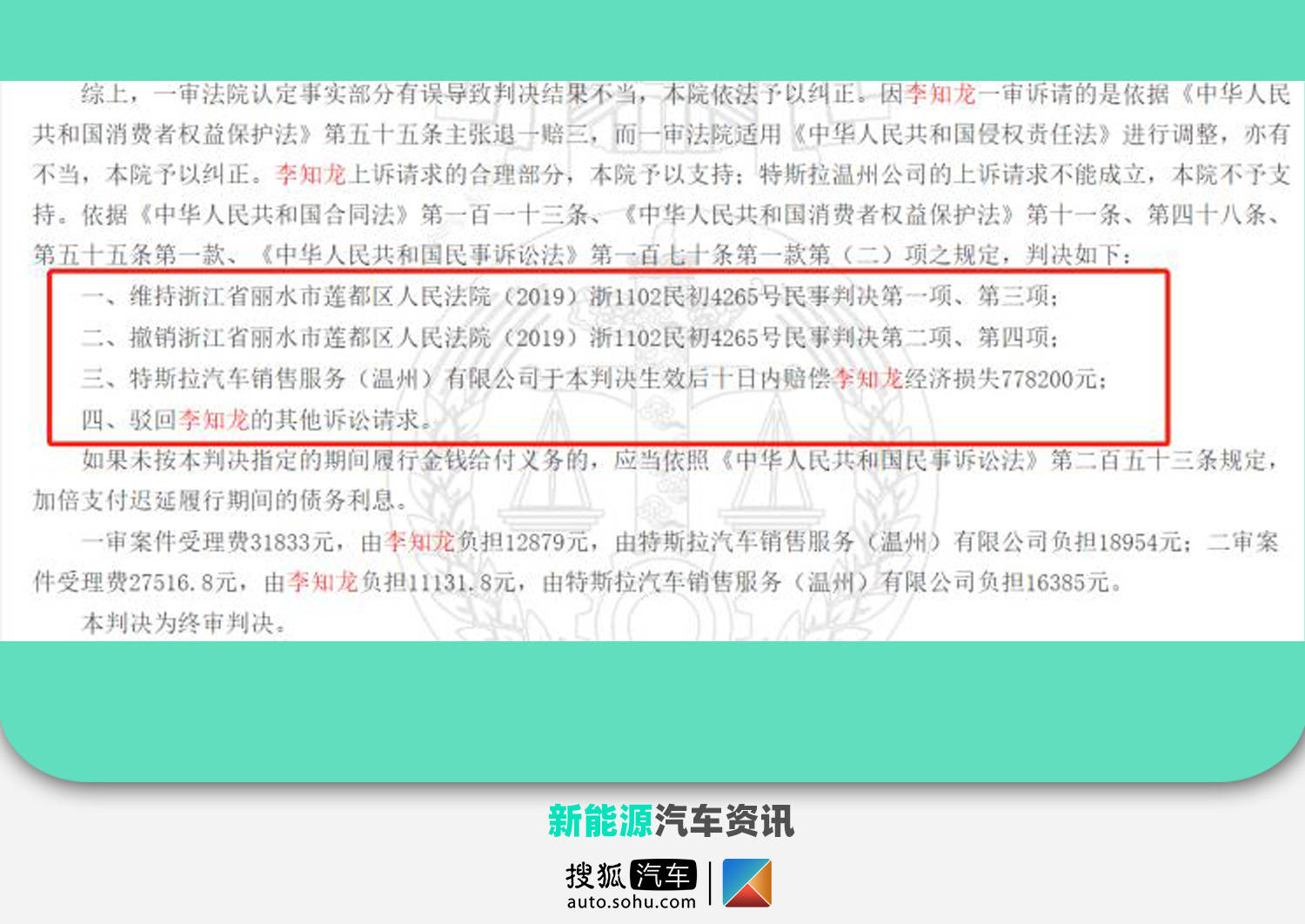 近日,浙江省丽水市中级人民法院发布了《李知龙、特斯拉汽车销售服务(温州)有限公司产品责任纠纷二审民事判决书》,其中显示,特斯拉汽车销售服务(温州)有限公司于本判决生效后十日内赔偿李知龙经济损失778200元,并退还购车款,即“退一赔一”。